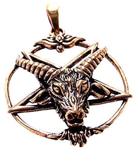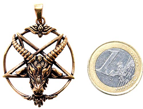 N° 143 : pentagramme Baphomet en bronze magnifiquement conçu. La tête de chèvre est très détaillée et soulignée en plastique. Le pendentif est partiellement noirci, de sorte que le design est mis en valeur de façon optimale. Le pentagramme est entouré d’une bague joliment décorée. Dimensions : environ 30 mm – Diamètre intérieur de l’œillet : environ 5,5 mm de haut x environ 4 mm de large – Poids : environ 7,3 g de fond : le pentagramme est une étoile à cinq branches et peut être dessiné en un seul trait. C’est un signe souvent utilisé dans l’art magique. Avec la pointe vers le bas, il est également appelé pied de drude et indique la magie noire. Parmi les satanistes, il est considéré comme un symbole du diable. Les deux dents supérieures du pentagramme sont interprétées comme cornes de satan. Au XIXe siècle, le magicien Eliphas Levi a pour la première fois le démon Baphomet avec sa tête de chèvre et son pentagramme sur le front. Depuis lors, cette représentation est très populaire dans les cercles occultes. En 1966, Anton Szandor LaVey a également utilisé le motif Baphomet comme sceau pour son Church of Satan.